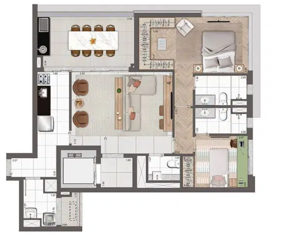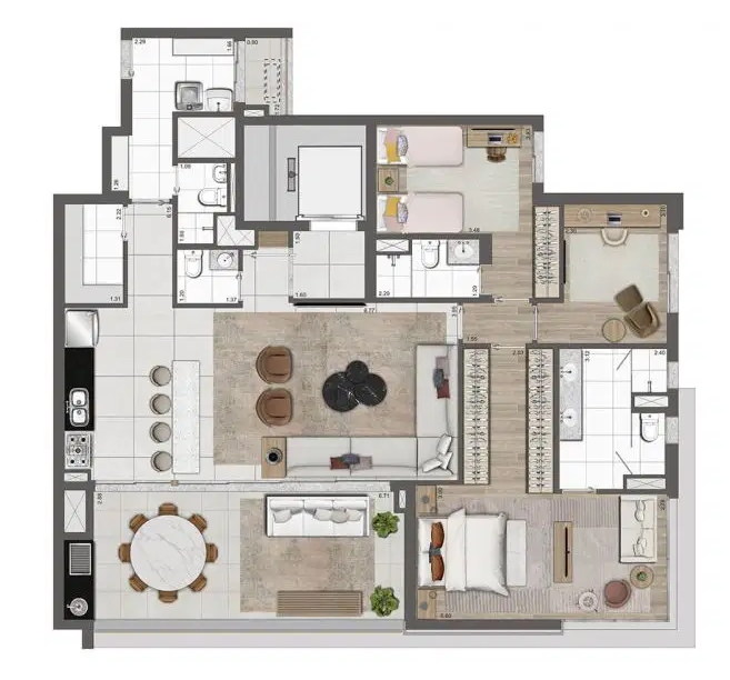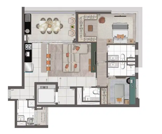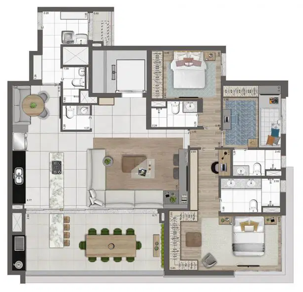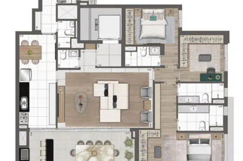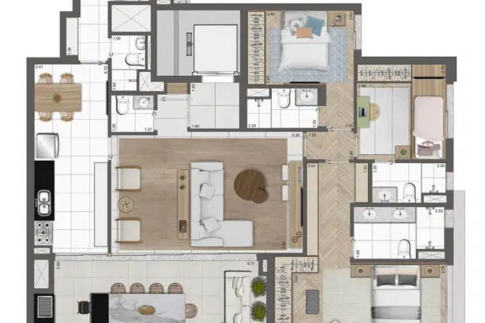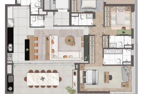 Os apartamentos variam de 102 a 192 m², incluindo opções penthouse, com plantas bem distribuídas, suítes amplas e duas vagas determinadas por unidade. O projeto valoriza tecnologia e sustentabilidade, oferecendo infraestrutura para ar-condicionado, medição individual de água e gás, reuso de água pluvial, gerador para áreas comuns e tomadas para veículos e bicicletas elétricas. As portas sociais e de serviço contam com fechaduras digitais, reforçando segurança e praticidade.